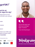 Vi uppmuntrar er att berätta för era elever om Tekniksprånget. Det är en chans för dem att kickstarta sin karriär och få en tydligare bild av vad de vill göra i framtiden.